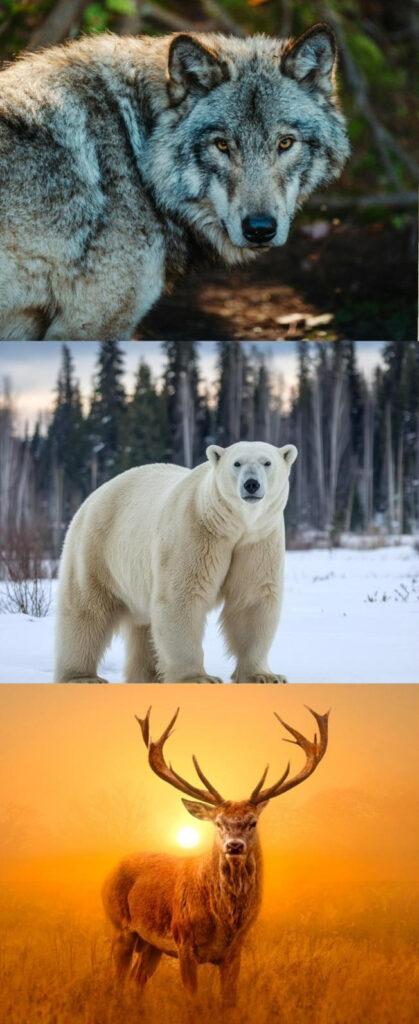 Wolf und Hirsch sind erdgebundene Heiler, wobei der Wolf besonders für Familie und Gemeinschaft steht, der auch sehr kraftvoll wirken kann, während der Hirsch ein unglaublich sanfter Heiler ist, der besonders für die ganz Zarten und Sensiblen, oder sehr geschwächten Menschen sanfte und liebevolle Energie und Heilung bringt. Die Große Bärin ist eine universelle Heilerin, sie trägt die urweibliche Schöpferkraft und uralte Medizin der Erde, die sehr sanft, aber auch sehr kraftvoll sein kann.